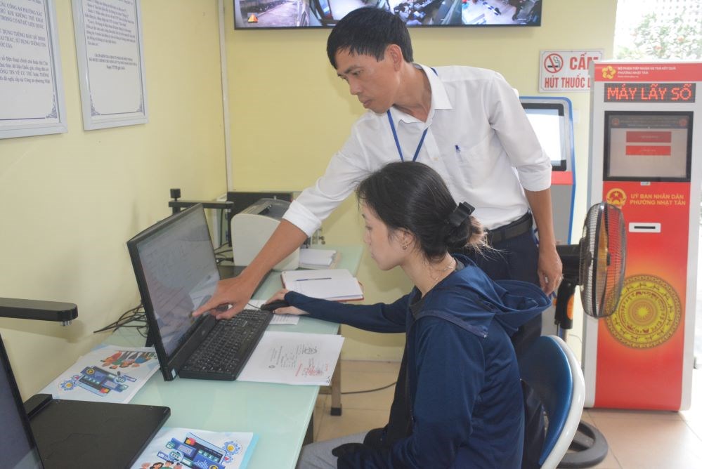 Cán bộ phường Nhật Tân (quận Tây Hồ, TP Hà Nội) hướng dẫn người dân làm thủ tục hành chính. |