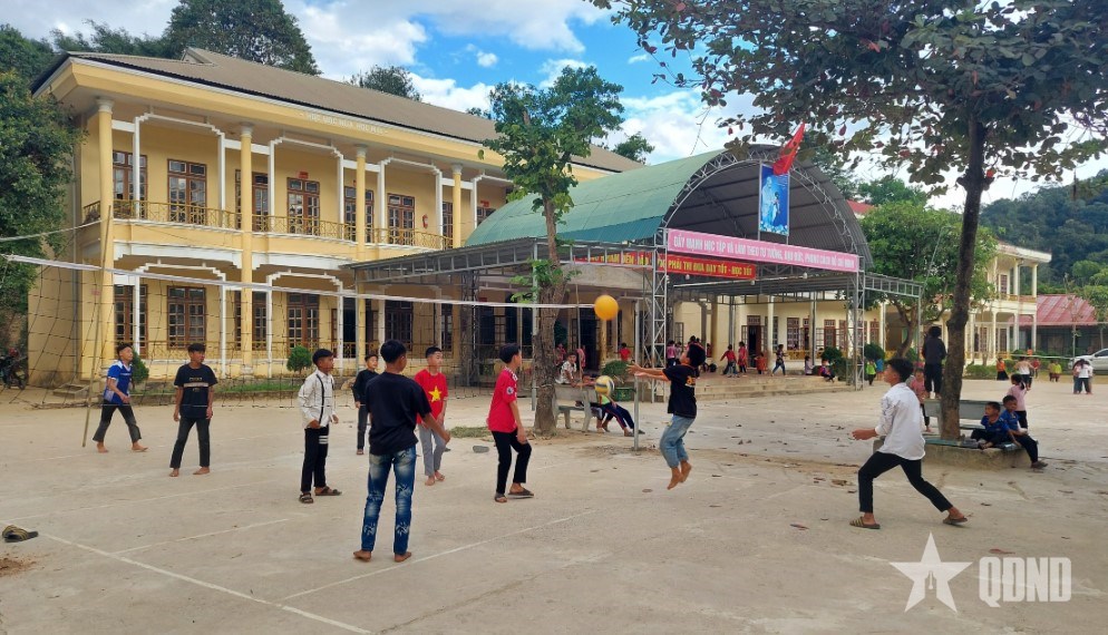 Học sinh Trường Phổ thông dân tộc bán trú Tiểu học và THCS Mường Lèo, xã Mường Lèo, huyện Sốp Cộp (Sơn La) chơi thể thao trong giờ ra chơi. Ảnh: LINH AN |
