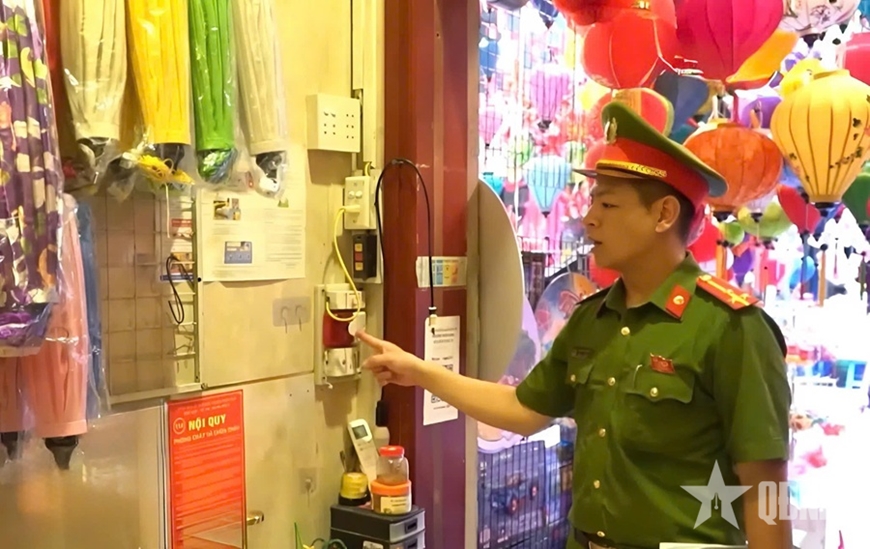 Công an phường Hoàn Kiếm kiểm tra hệ thống điện và báo cháy tại một cửa hàng trên phố Hàng Mã (Hà Nội). |