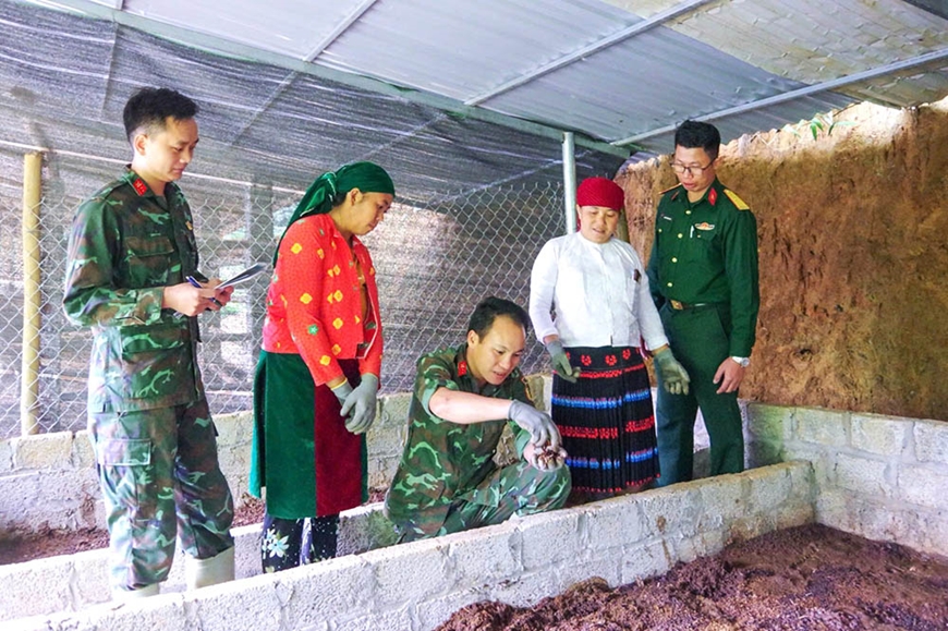 Cán bộ Đoàn Kinh tế - Quốc phòng 313 hướng dẫn nuôi giun quế cho hộ dân ở xã Thàng Tín (Tuyên Quang).