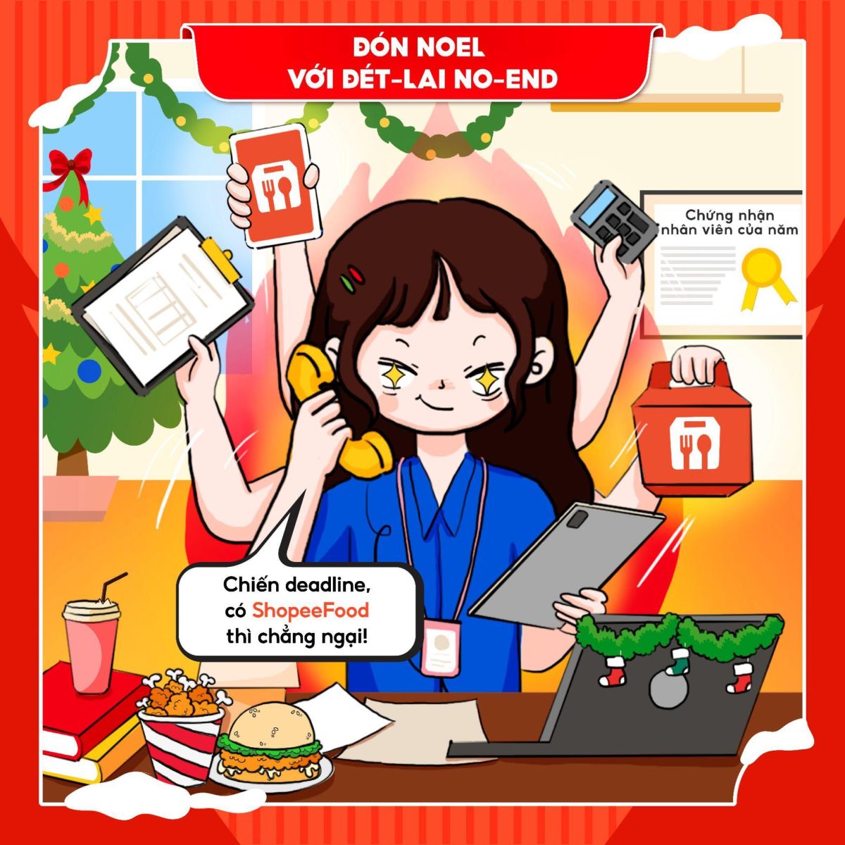Nhưng với hội chạy deadline, Giáng sinh này chẳng hề cô đơn, bởi đã có ShopeeFood kề bên, mang đến những món ngon tiện lợi, cùng bạn tiếp thêm năng lượng và giữ tinh thần luôn hứng khởi giữa guồng công việc. Ai cầu nguyện Noel này có người yêu thì cứ cầu, còn với team “hết mình với công việc” thì chỉ mong hoàn thành xong sớm deadline và có món ngon “up mood” bên cạnh là Giáng sinh đã trọn vẹn lắm rồi.