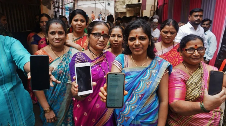 | Những phụ nữ ở bang Maharashtra (Ấn Độ) nhận tiền hỗ trợ hằng tháng qua tài khoản ngân hàng. Ảnh: BBC |