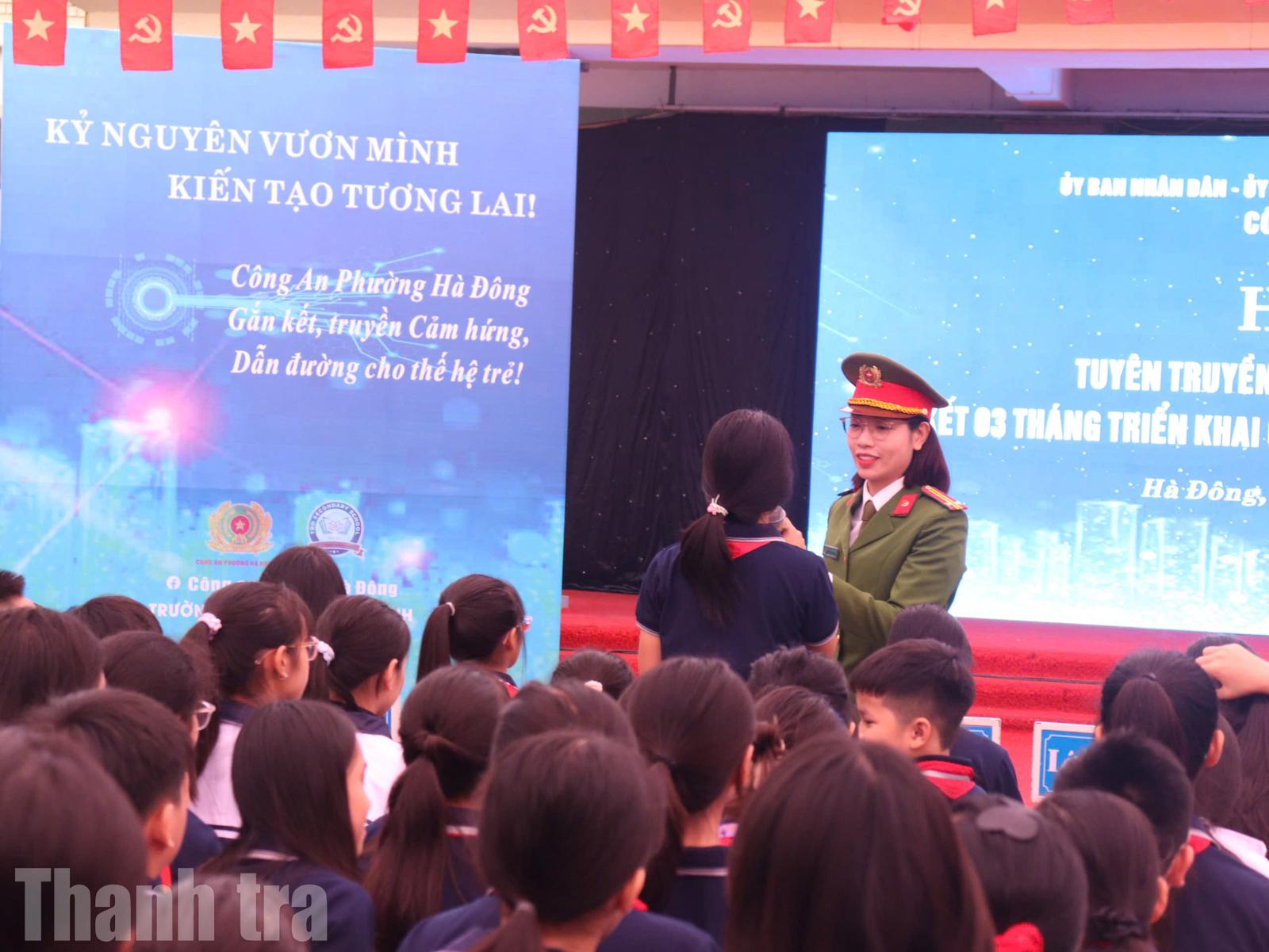 Công an phường Hà Đông, Hà Nội tuyên truyền, phổ biến pháp luật về TTATGT cho học sinh trên địa bàn. Ảnh: TM