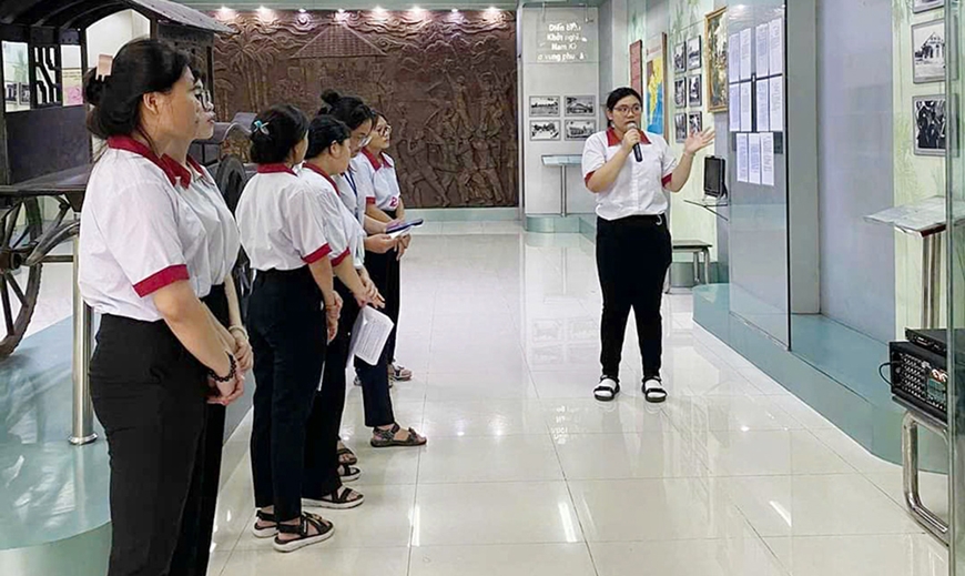 | Sinh viên thực tập kỹ năng thuyết trình tại di tích Ngã ba Giồng. |