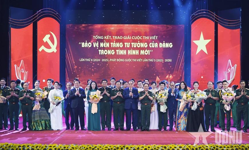Đại biểu tặng hoa nghệ sĩ, diễn viên tham gia Tổng kết và trao giải Cuộc thi viết “Bảo vệ nền tảng tư tưởng của Đảng trong tình hình mới” lần thứ 4 do Báo Quân đội nhân dân và Hội Nhà báo Việt Nam phối hợp tổ chức, tháng 5-2025. Ảnh: TUẤN HUY