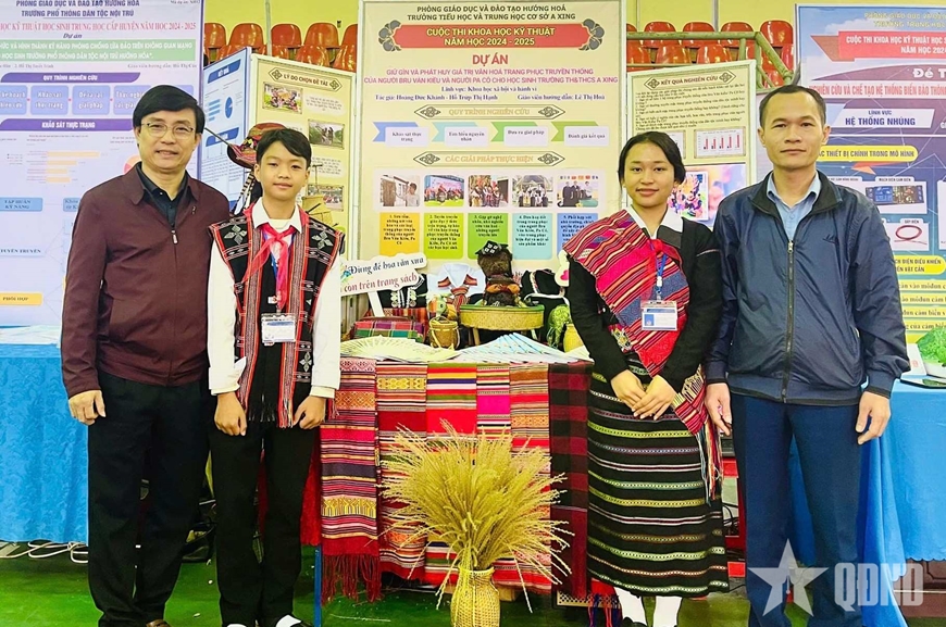 Thầy Nguyễn Mai Trọng (ngoài cùng bên trái) và các học sinh của Trường Tiểu học và Trung học cơ sở A Xing tham dự Cuộc thi Khoa học kỹ thuật năm học 2024-2025. |