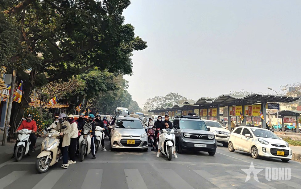 Các phương tiện giao thông dừng chờ đèn đỏ tại nút giao Yên Phụ - Hàng Đậu (Hà Nội). Ảnh: LINH AN |