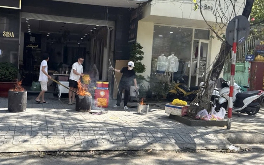| Người dân ở một tuyến đường thuộc trung tâm TP Đà Nẵng đốt vàng mã trên vỉa hè. |