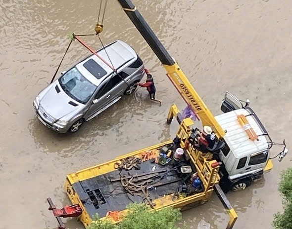 Xe ô tô bị ngập trong nước được xe cứu hộ cẩu lên |