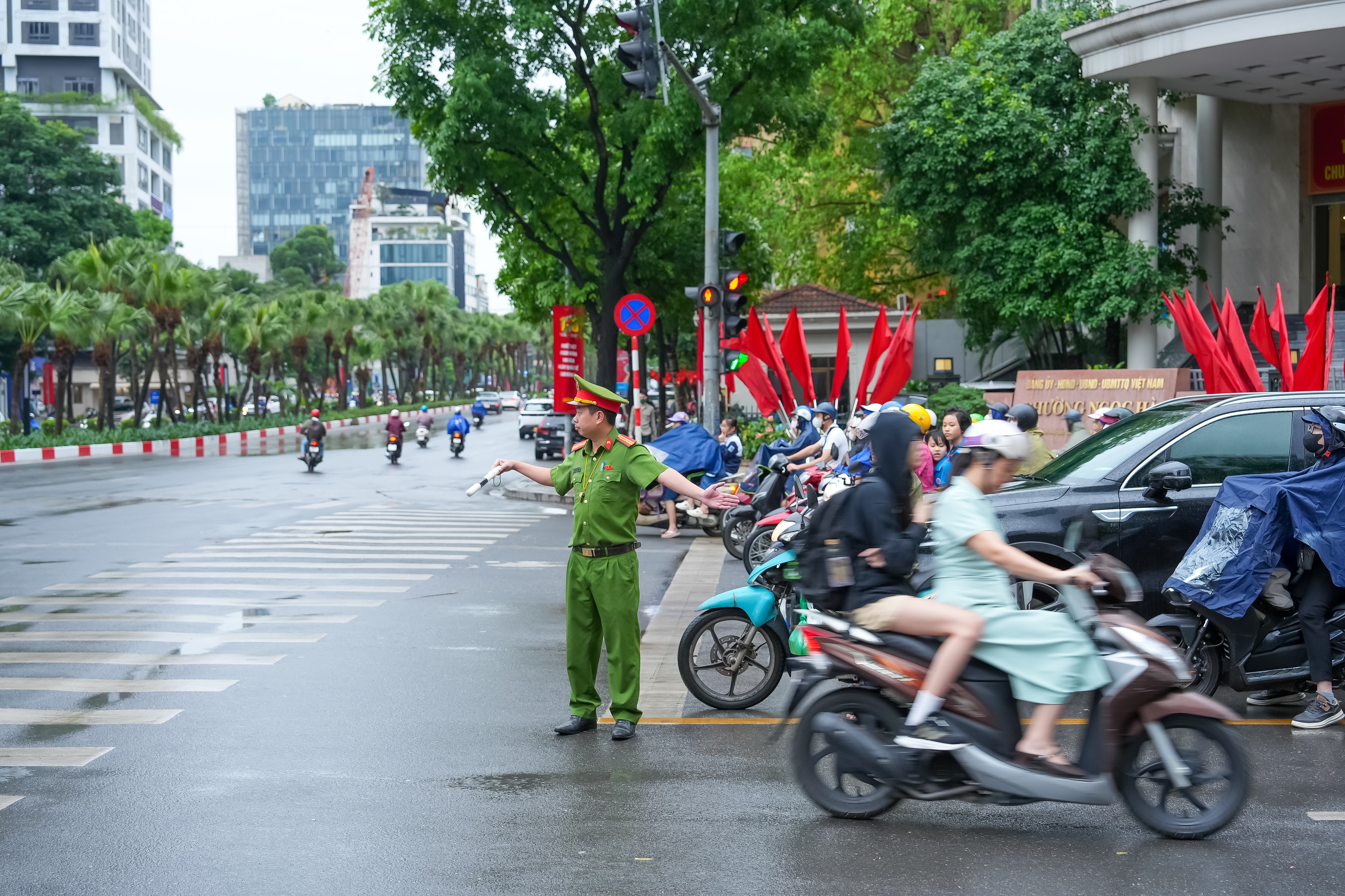 Lực lượng chức năng điều tiết giao thông trên địa bàn phường Ngọc Hà. Ảnh: Duy Khánh