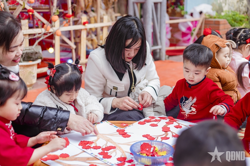 Các em học sinh và phụ huynh cùng tham gia trải nghiệm cắt dán hoa đào Tết. |
