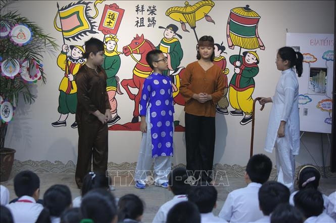 | Học sinh tham gia trải nghiệm cùng di sản tại Văn Miếu - Quốc Tử Giám. Ảnh: TTXVN |