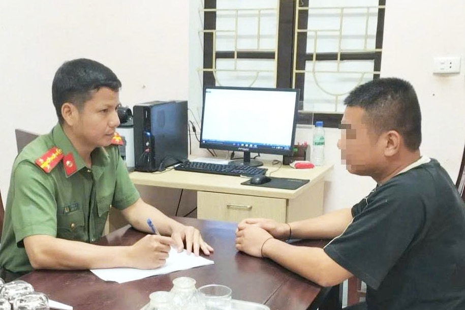 Cán bộ công an làm việc với đối tượng tung tin vỡ đập thủy điện Bản Vẽ (tỉnh Nghệ An).