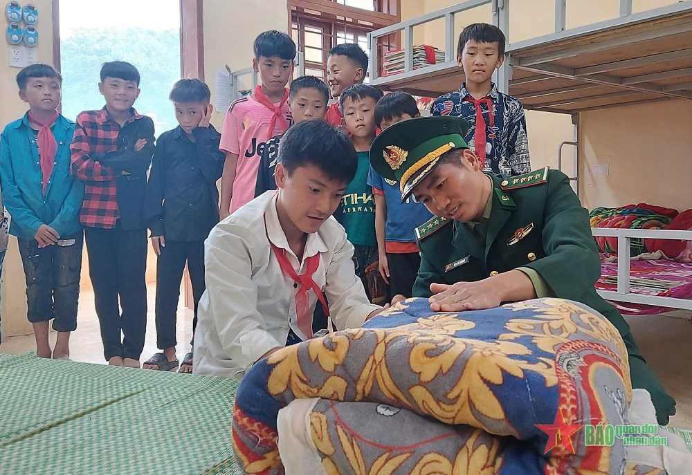 | Cán bộ Đồn Biên phòng Mường Lèo, Bộ đội Biên phòng tỉnh Sơn La hướng dẫn học sinh Trường Phổ thông dân tộc bán trú Tiểu học và THCS Mường Lèo gấp chăn. |