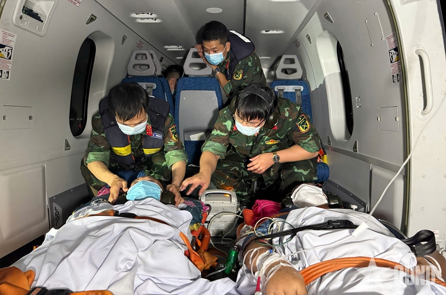 Bác sĩ theo dõi, chăm sóc các bệnh nhân trên trực thăng trong quá trình vận chuyển.