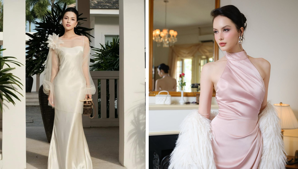 Các thiết kế đầm lụa dáng midi, slip dress hoặc cổ đổ đặc biệt phù hợp với những buổi tiệc trang trọng. Màu sắc nên thiên về gam trầm như rượu vang, xanh ngọc, be, nâu nhạt hoặc pastel để tạo cảm giác sang hơn.