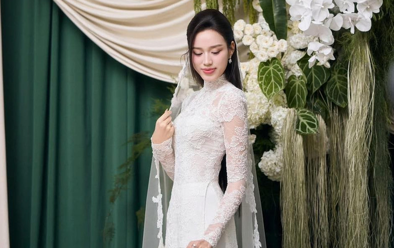 Đỗ Thị Hà xuất hiện trong tà áo dài ren trắng ôm sát thân hình, toát lên vẻ dịu dàng, thanh lịch và nữ tính.