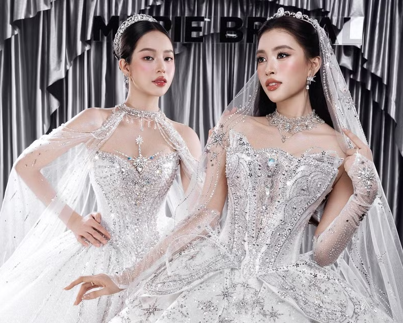 Xuất hiện trong những thiết kế váy cưới lộng lẫy, cả Tiểu Vy và Thanh Thủy đều toát lên vẻ đẹp riêng biệt nhưng hài hòa trong cùng một khung hình.