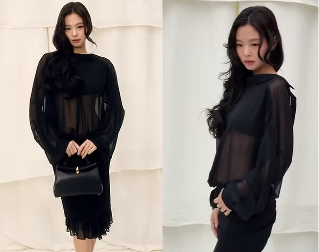 Jennie xuất hiện đầy ấn tượng khi diện chiếc váy màu đen với phần thân áo xuyên thấu cùng đường cắt táo bạo vô cùng gợi cảm. Bộ trang phục tôn lên vóc dáng thon thả, tự nhiên của nữ ca sĩ, đồng thời vẫn giữ được vẻ thanh lịch và quyến rũ.