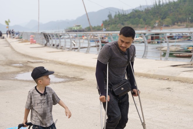 Dù phải chống nạng, Duy Hưng vẫn không bỏ lỡ hành trình cùng con trai