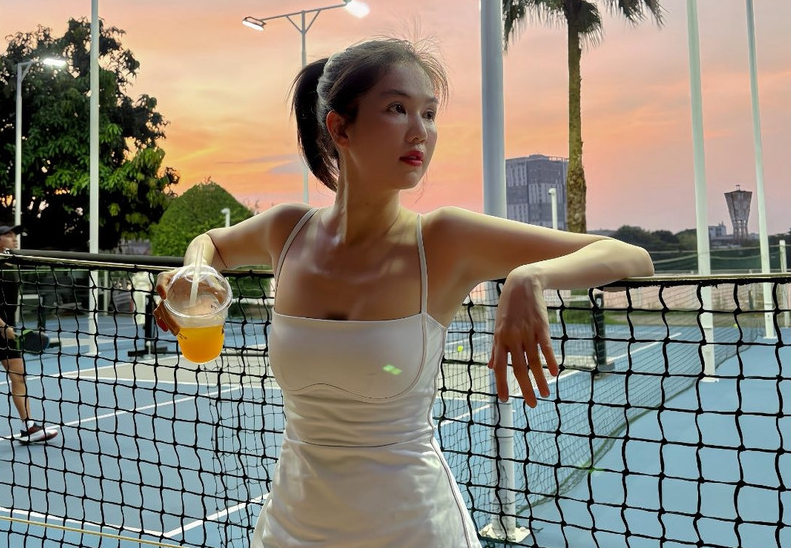 Ngọc Trinh tự tin diện trên mình chiếc váy hai dây dáng ngắn ôm sát cơ thể, khoe khéo dáng đẹp cùng đôi chân thon dài trên sân pickeball.