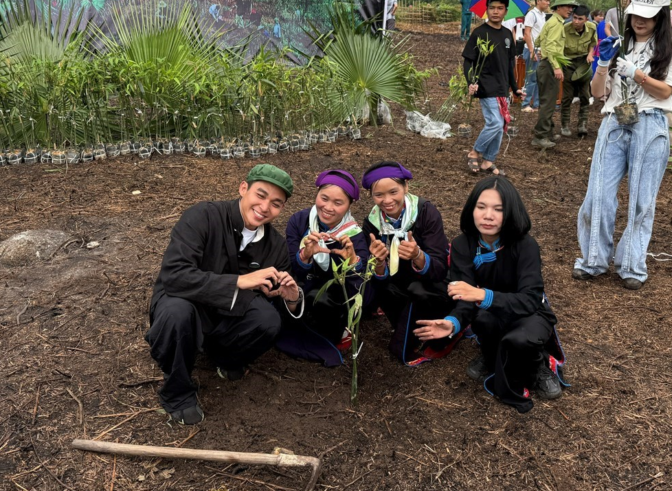 Ca sĩ Jun Phạm (bên trái), thành viên của “Gia đình Haha” tham gia ra quân trồng cây phủ xanh đồi trọc tại Bản Liền