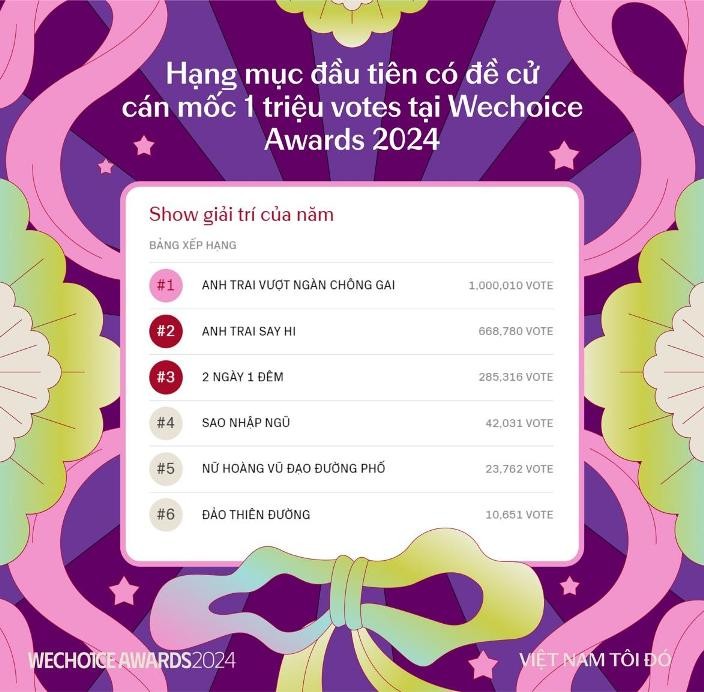 Ngay sau đó, trải qua gần 5 ngày bình chọn chính thức, WeChoice Awards đã chính thức có đề cử đạt mốc 1 triệu lượt bình chọn. Lượt bình chọn áp đảo này thuộc về đề cử Show giải trí của năm, show Anh Trai Vượt Ngàn Chông Gai đã vươn lên top đầu, có số vote cao nhất và chính thức chạm mốc 1 triệu lượt bình chọn vào chiều 29/12. Đáng chú ý, đây là lần đầu tiên WeChoice Awards có đề cử cán mốc 1 triệu lượt vote.