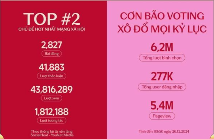 Đặc biệt, chỉ sau 1 ngày mở cổng bình chọn, WeChoice Awards 2024 đã tạo ra kỷ lục, thiết lập những con số “khủng” chưa từng có như: 6.264.140 triệu lượt vote cho các đề cử; 277.856 nghìn độc giả tham gia bình chọn, lượt tải trang lên tới 5.4 triệu,... (Số liệu được ghi nhận lúc 10h50 ngày 26/12/2024).
