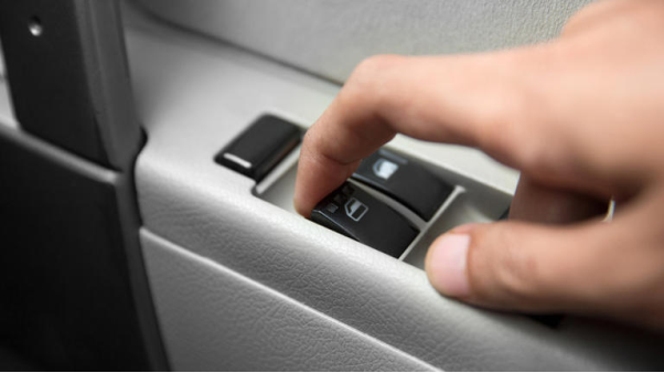 Cận cảnh bàn tay nhấn nút điều khiển cửa sổ tự động trong xe hơi. Ảnh: Odua Images