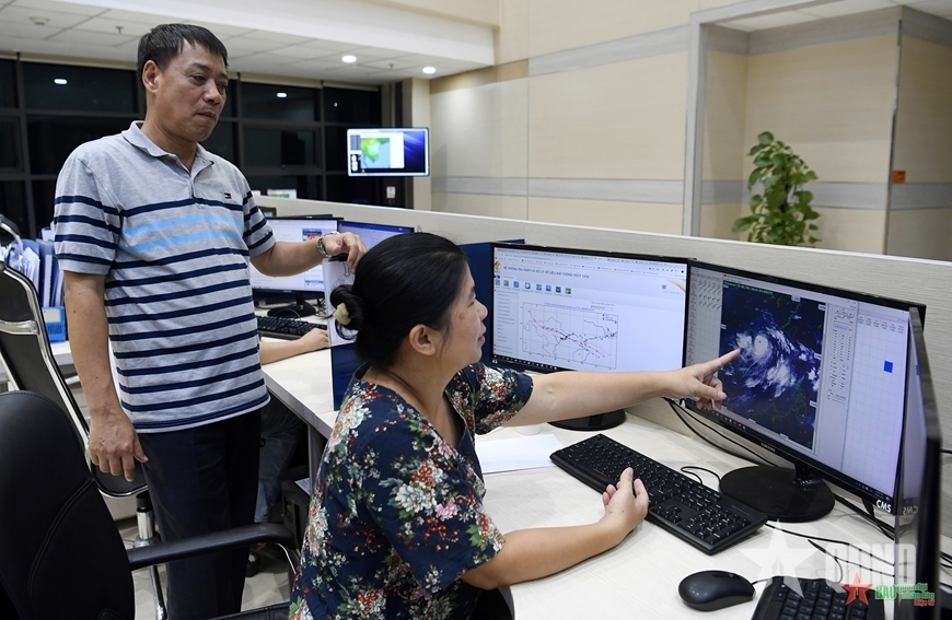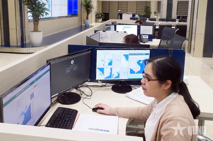 Cán bộ Cục Khí tượng Thủy văn sử dụng các công nghệ hiện đại để dự báo khí tượng thủy văn. Ảnh: LA QUANG DUY