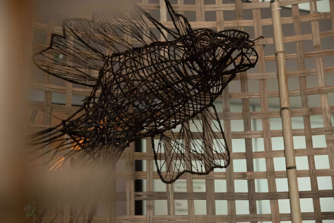 Trong không gian đầy ấn tượng của những hoa văn họa tiết kiến trúc với cảm hứng từ thuyền thúng tre truyền thống Việt Nam, NTK Lâm Gia Khang thể hiện, sắp đặt trong từng tác phẩm nghệ thuật (Artwork) bằng ngôn ngữ trầm lắng.