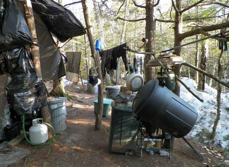 Cuối cùng, Knight định cư tại một khoảng đất trống nhỏ gần North Pond, cách các túp lều nghỉ dưỡng gần nhất khoảng một dặm. Ông dựng một nơi ở tạm bợ bằng bạt căng giữa các cây chồng lên nhau để che khuất tầm nhìn từ trên cao và che mưa. Dần dần, rêu và lá cây phủ kín đồ đạc của ông.