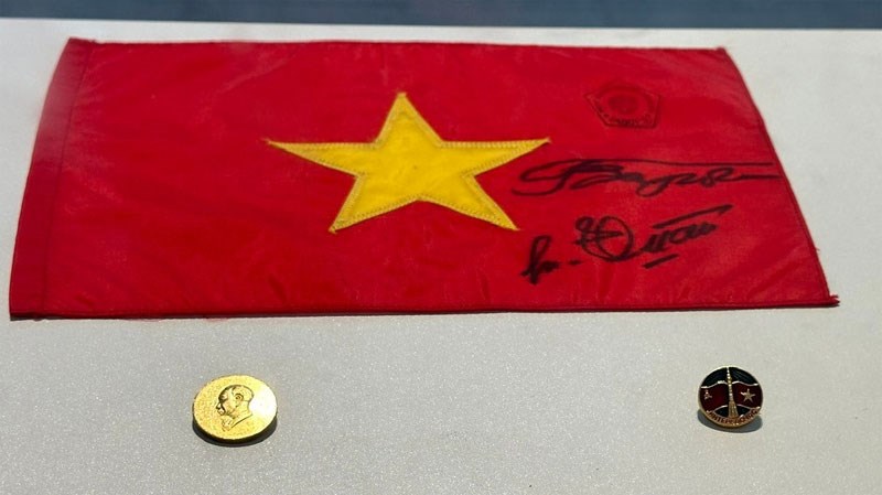 Bộ sưu tập hiện vật gồm Cờ Tổ quốc, Huy hiệu in hình Bác Hồ, Huy hiệu Whtepkocmoc của Anh hùng Lực lượng vũ trang nhân dân, Trung tướng, phi công Phạm Tuân. |