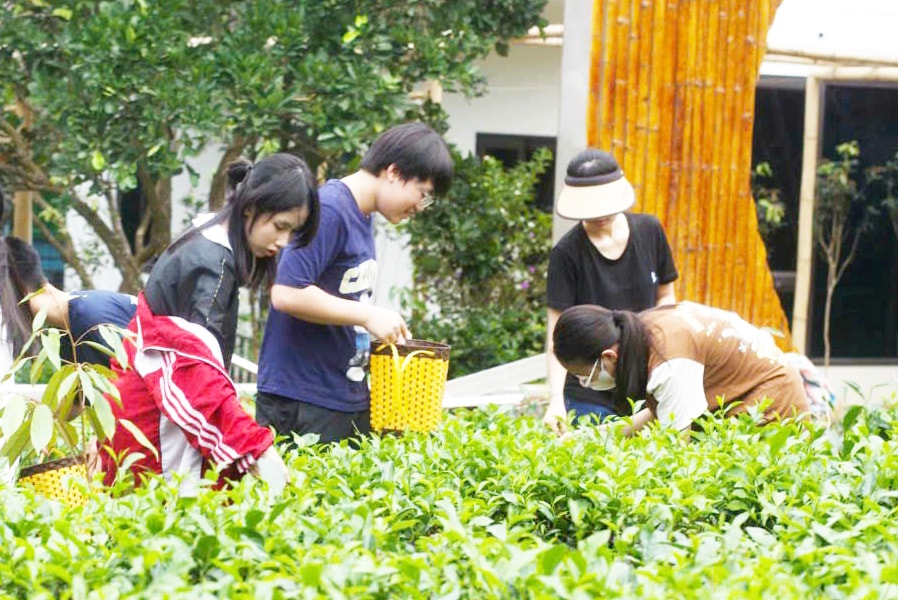 Du khách tham quan vườn chè OCOP và trải nghiệm hoạt động hái chè ở xã Yên Bài.