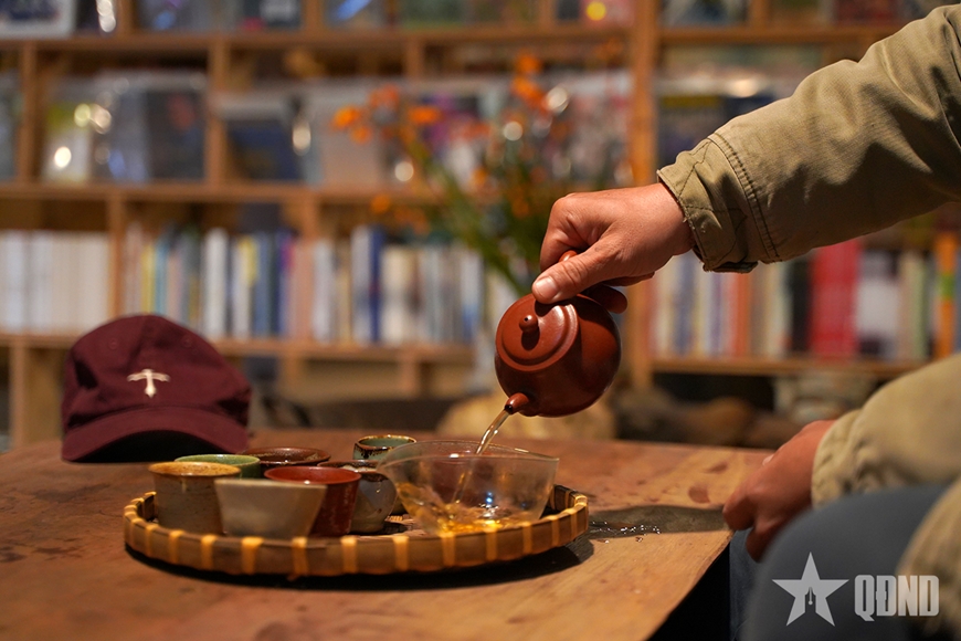 Khi mẻ chè đầu tiên hoàn tất, chị Pla múc ít chè cho vào ấm đất, rót nước sôi. Hơi trà bốc lên, trong veo như sương. Màu nước vàng nhạt, ánh nắng cuối ngày phản chiếu qua khung cửa gỗ làm nước trà sáng lên như mật ong.