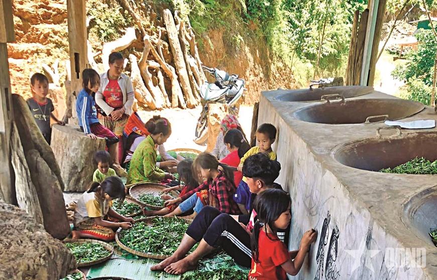Bà con trong làng cùng nhau sơ chế chè sau khi thu hoạch. |