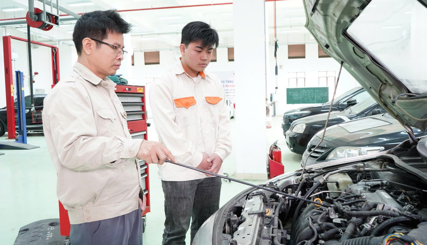 Sinh viên Trường Cao đẳng Nghề Hà Nam trong giờ thực hành về động cơ ô tô. Ảnh: Đình Tuệ