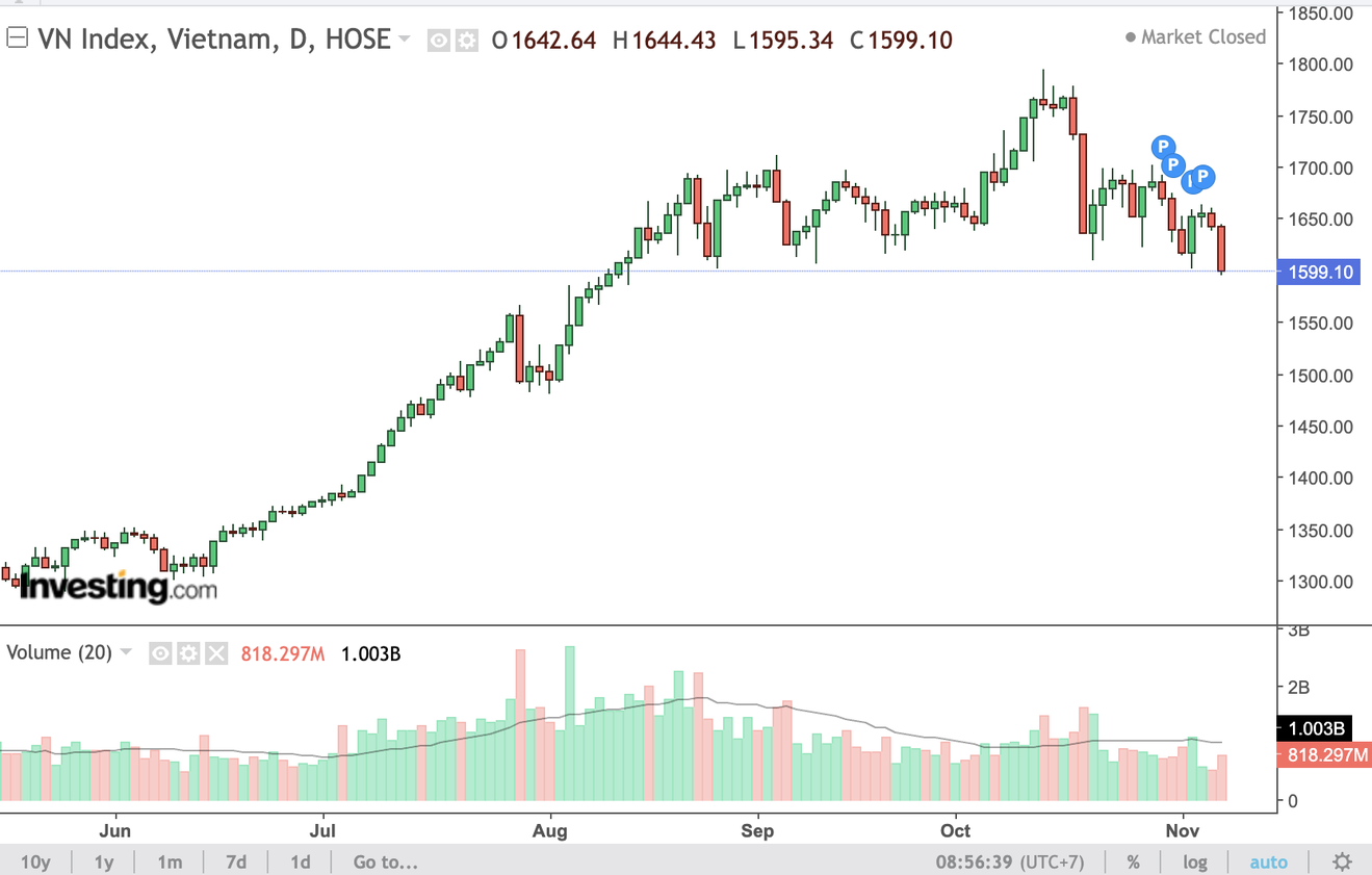 Thị trường chứng khoán Việt Nam vừa khép lại tuần đầu tiên của tháng 11/2025 với sắc đỏ bao trùm, khi chỉ số VN-Index giảm tuần thứ 4 liên tiếp, đánh dấu chuỗi giảm dài nhất kể từ giữa tháng 8/2024. Kết thúc tuần, VN-Index dừng ở 1.599,1 điểm, giảm 40,55 điểm (-2,5%) so với tuần trước, đồng thời rơi xuống mức thấp nhất trong tuần. Tính từ đỉnh gần nhất, thị trường đã mất hơn 200 điểm (-11,2%).