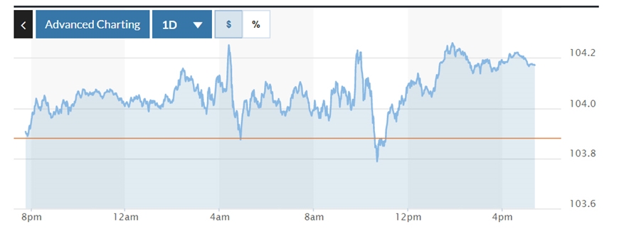 Trong khi đó, trên thị trường Mỹ, chỉ số US Dollar Index (DXY) đo lường biến động đồng bạc xanh với 6 đồng tiền chủ chốt (EUR, JPY, GBP, CAD, SEK, CHF) tăng 0,3% cán mốc 104,17.