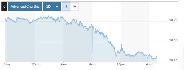 Trên thị trường Mỹ, chỉ số US Dollar Index (DXY) đo lường biến động đồng bạc xanh với 6 đồng tiền chủ chốt (EUR, JPY, GBP, CAD, SEK, CHF) giảm 0,45%, hiện ở mức 98,31.