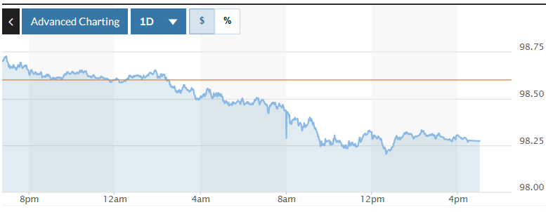 Trên thị trường Mỹ, chỉ số US Dollar Index (DXY) đo lường biến động đồng bạc xanh với 6 đồng tiền chủ chốt (EUR, JPY, GBP, CAD, SEK, CHF) giảm 0,33%, hiện ở mức 98,27.
