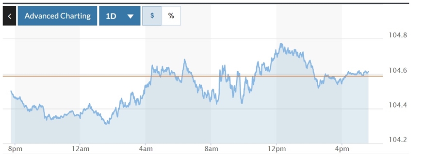 | Biểu đồ biến động Chỉ số DXY trong 24 giờ qua. Ảnh: Marketwatch. |