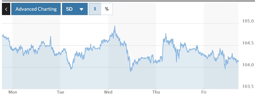 Phiên giao dịch chốt tuần vừa qua, trên thị trường quốc tế, chỉ số USD Index (DXY), đo lường biến động đồng bạc xanh với 6 đồng tiền chủ chốt đứng ở mức 104,12, giảm 0,55%.