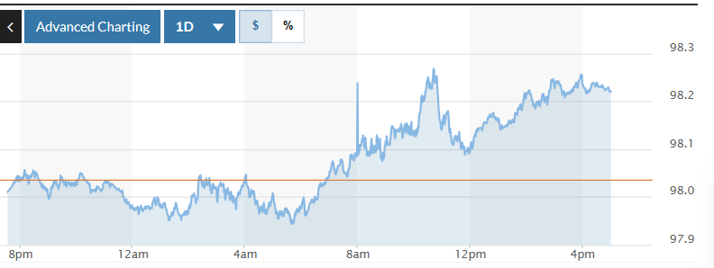 Biểu đồ biến động Chỉ số DXY trong 24 giờ qua. Ảnh: Marketwatch |