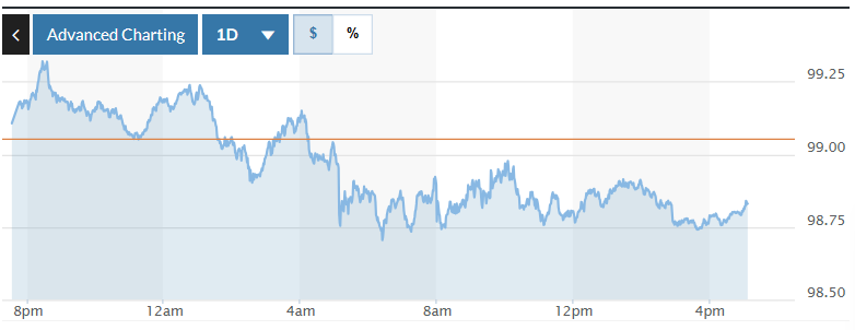 Biểu đồ biến động Chỉ số DXY trong 24 giờ qua. Ảnh: Market watch