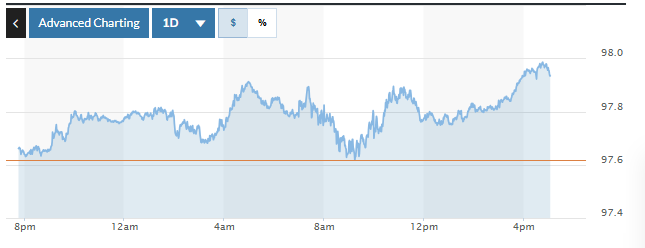 | Biểu đồ biến động Chỉ số DXY trong 24 giờ qua. Ảnh: Market watch |