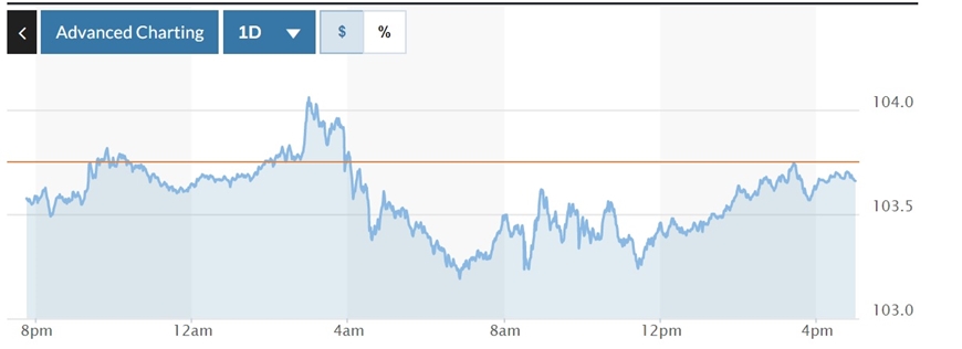 Phiên giao dịch chốt tuần vừa qua, trên thị trường quốc tế, chỉ số USD Index (DXY), đo lường biến động đồng bạc xanh với 6 đồng tiền chủ chốt đứng ở mức 103,66, tăng 0,68%.