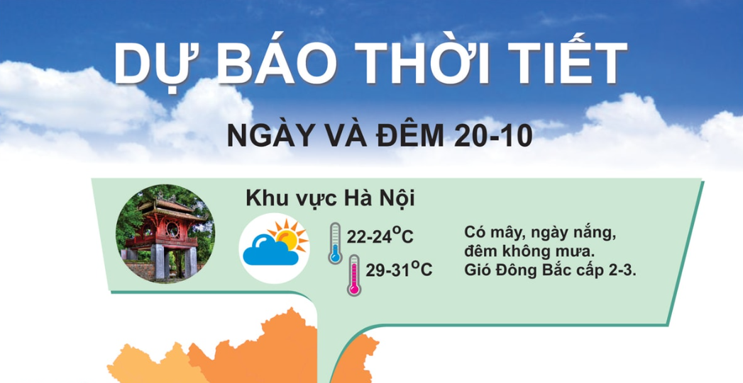 Khu vực Bắc Bộ hôm nay (20-10) này nắng, đêm trời chuyển lạnh với nhiệt độ thấp nhất phổ biến ở mức 21-23 độ C, vùng núi cao nhiều nơi dưới 16 độ C.