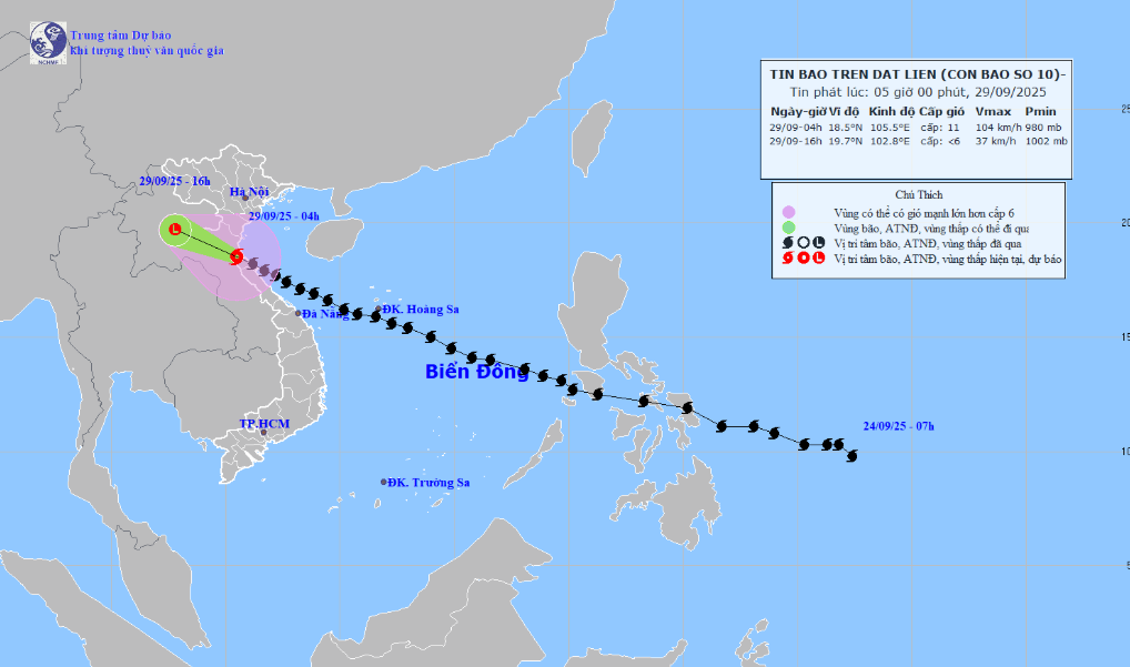 Vào 7h sáng nay 29/9, tâm bão số 10 vẫn đang ở Nghệ An- Hà Tĩnh |
