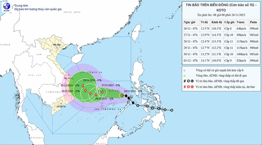 Trong khoảng ngày 27 đến 28-11, khu vực giữa Biển Đông (bao gồm vùng biển phía Bắc đặc khu Trường Sa) có khả năng chịu tác động của gió mạnh cấp 11, giật cấp 14, sóng biển cao 7,0-9,0m, biển động dữ dội.